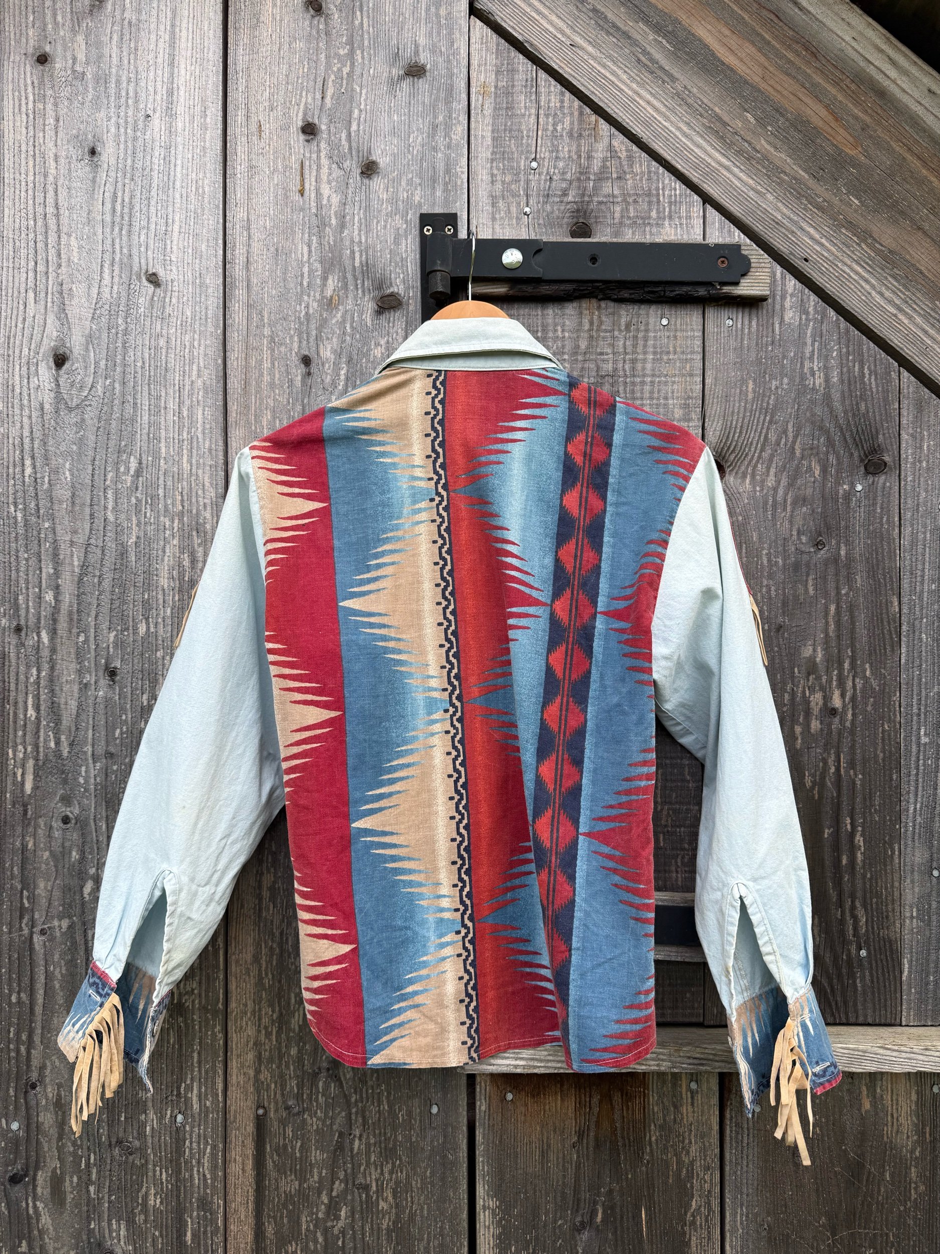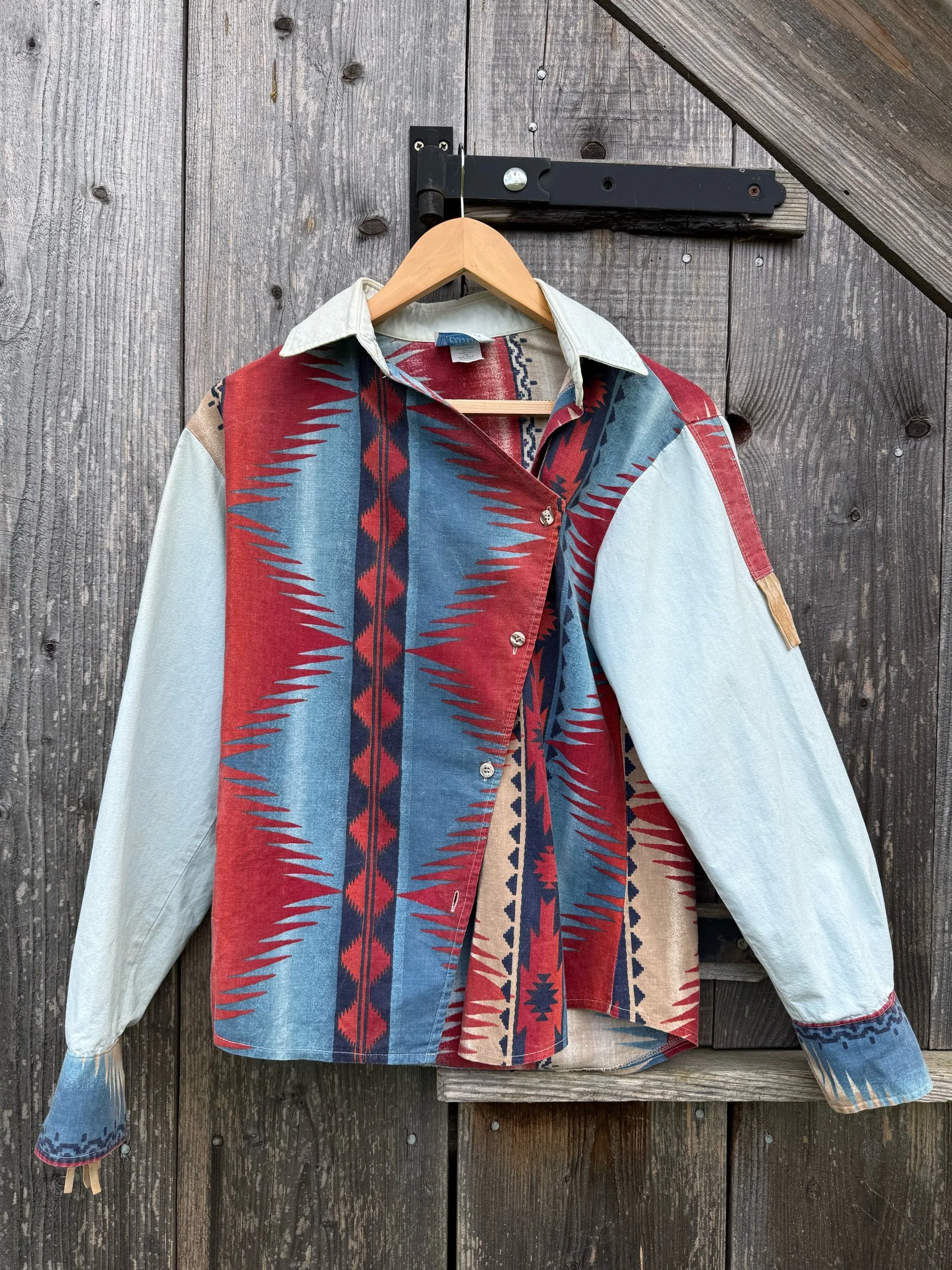 asymmetric closure, southwestern pattern, small fringe on the shoulders and cuffs